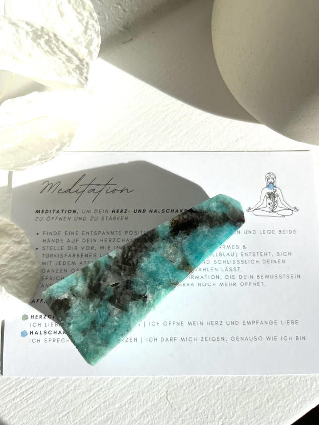 Dein Amazonit - Tower ist ein Unikat, wird von mir intuitiv ausgesucht und kann leicht von den Steinen auf dem Foto abweichen. Die beigefügte Karte im A6-Format hält auf der Vorder- und Rückseite schöne Impulse für deine spirituelle Persönlichkeitsentwicklung bereit.