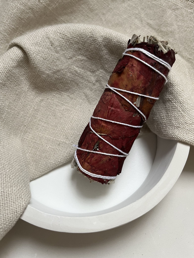 Ein Räucherbündel aus weißem Salbei mit Rosenblätter kombiniert die kraftvolle Reinigungskraft von Salbei mit der aphrodisierenden Wirkung von Rosen. Weißer Salbei vertreibt negative Energien und klärt die Atmosphäre, während die Rose für Entspannung und Harmonie sorgt. Ideal für die energetische Reinigung von Menschen & Räumen.